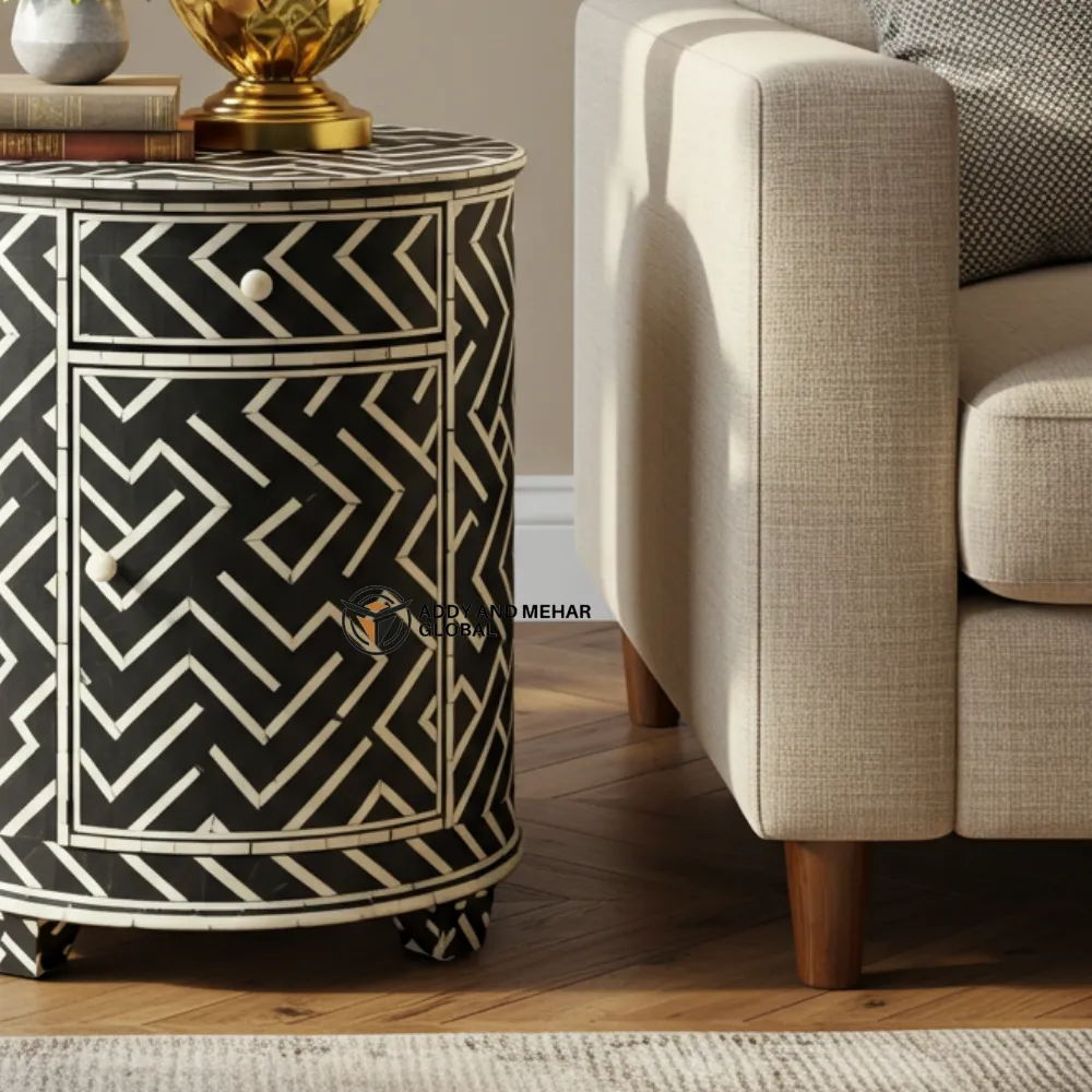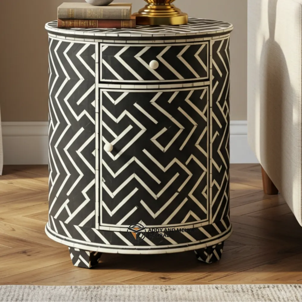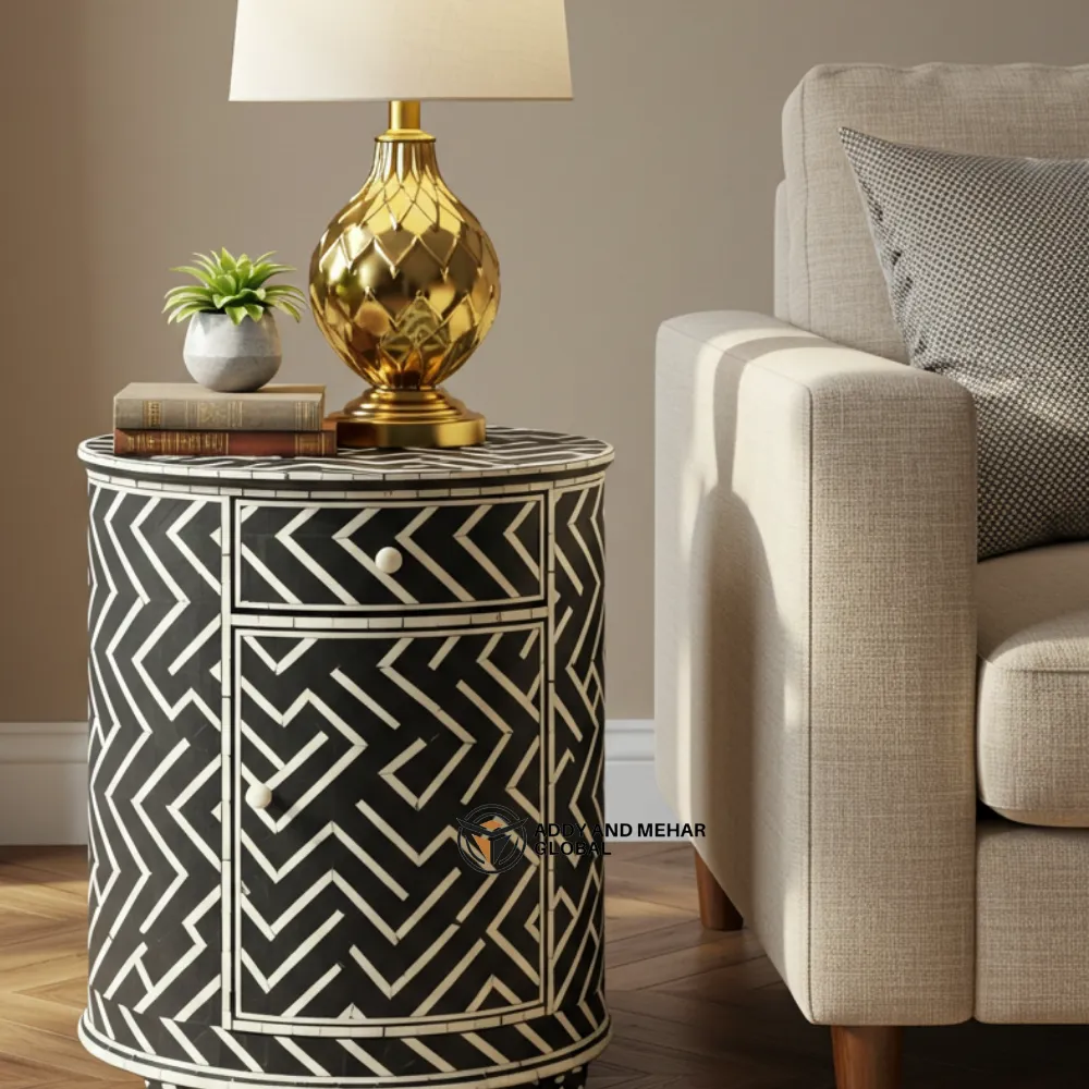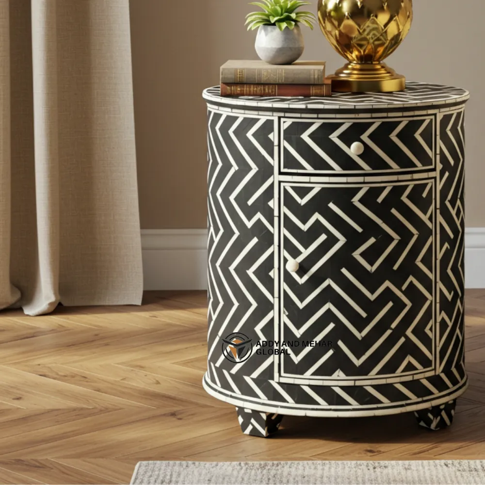 Elevate your interior with this black chevron bone inlay side table, a perfect blend of bold design and handcrafted artistry. Expertly made by skilled artisans, this piece features a striking geometric chevron pattern in contrasting bone inlay, set against a deep black base for a dramatic and elegant look.