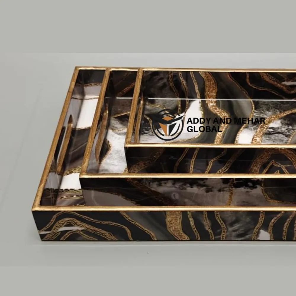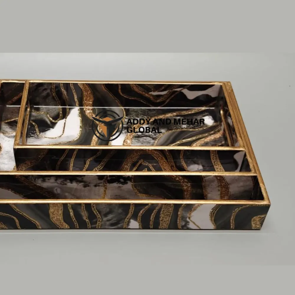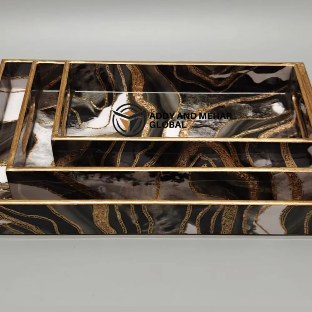 Black & Gold Geometric Enamel Serving Tray Set of 3 – Luxury MDF & Paper Nesting Serving Trays for Kitchen, Dining & Home Decor