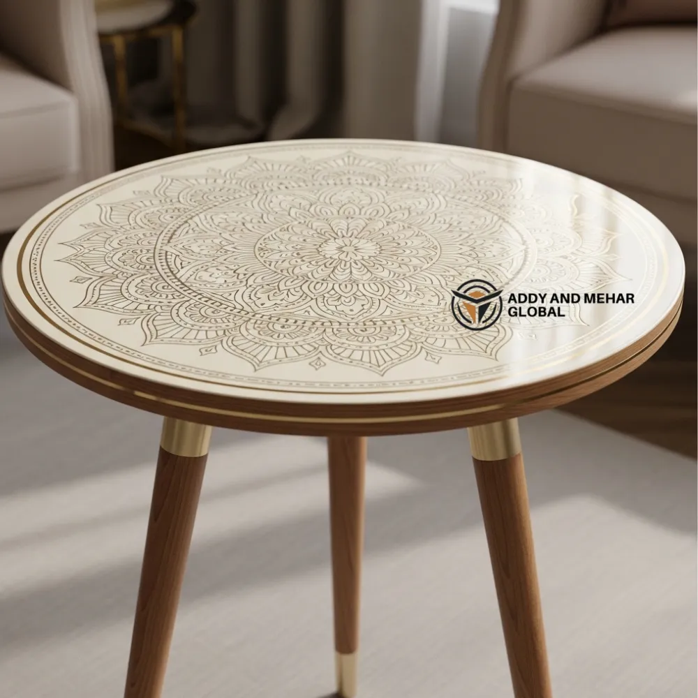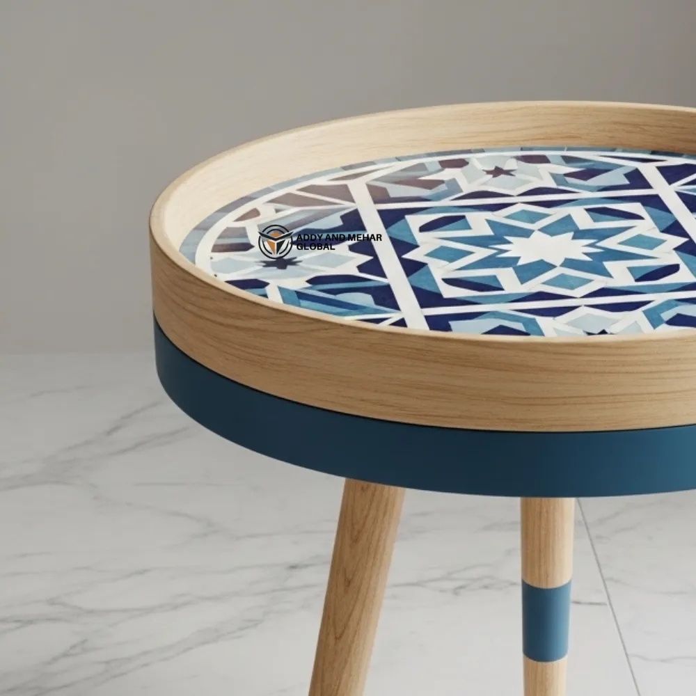 Blue Meena Design Wooden Stool – Handcrafted Round Decorative Tripod Accent Stool