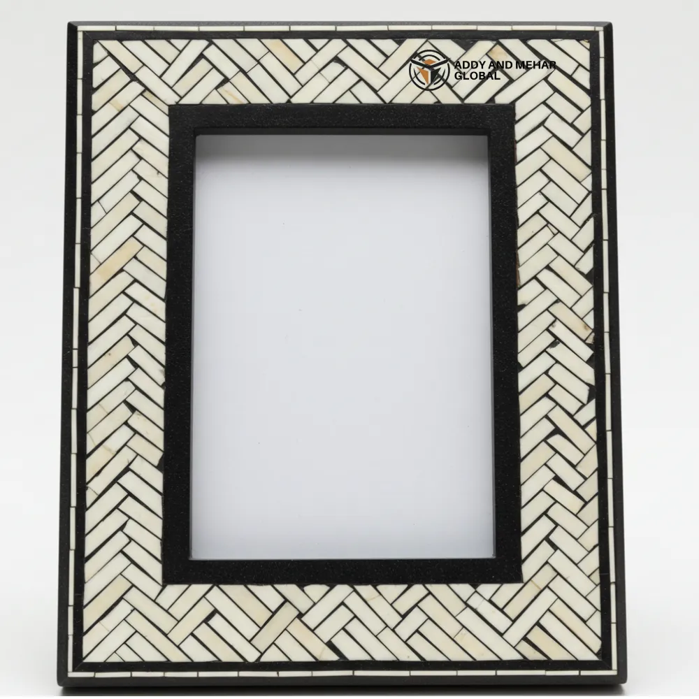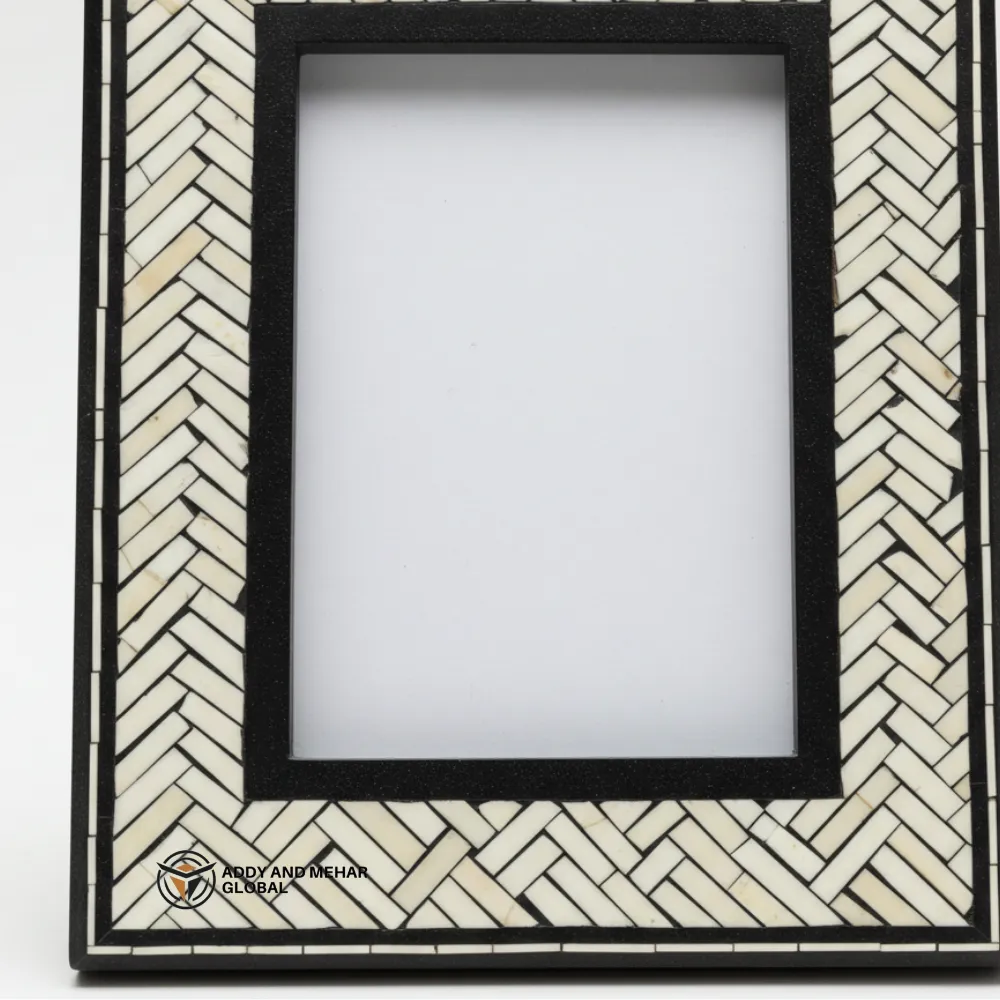 Handcrafted Bone Inlay Photo Frame featuring a bold black and white chevron pattern. A stylish decorative piece perfect for displaying memories while adding a modern artisan touch to your home décor.