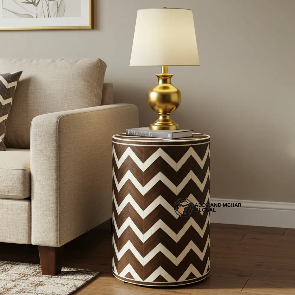 Emerald Green Chevron Bone Inlay Side Table – Handmade Luxury Wooden End Table | Modern Boho Accent Furniture