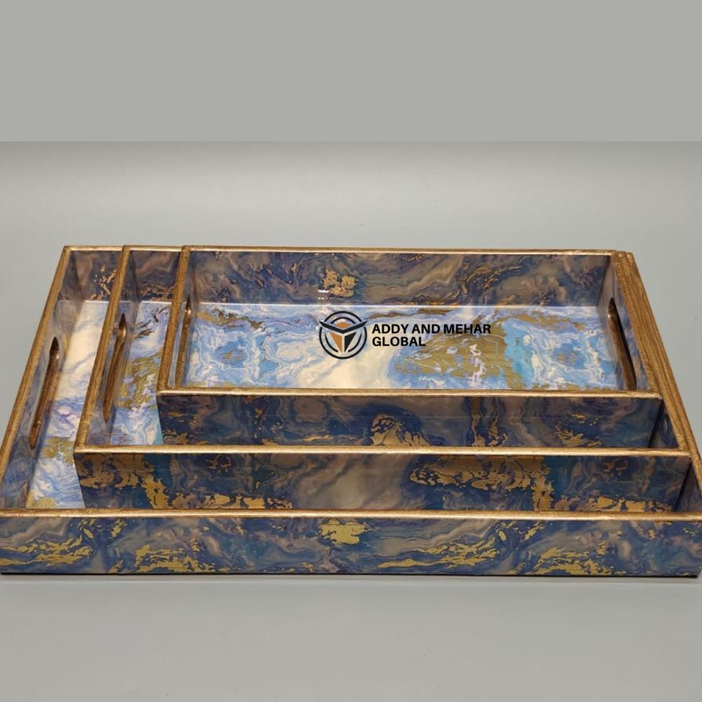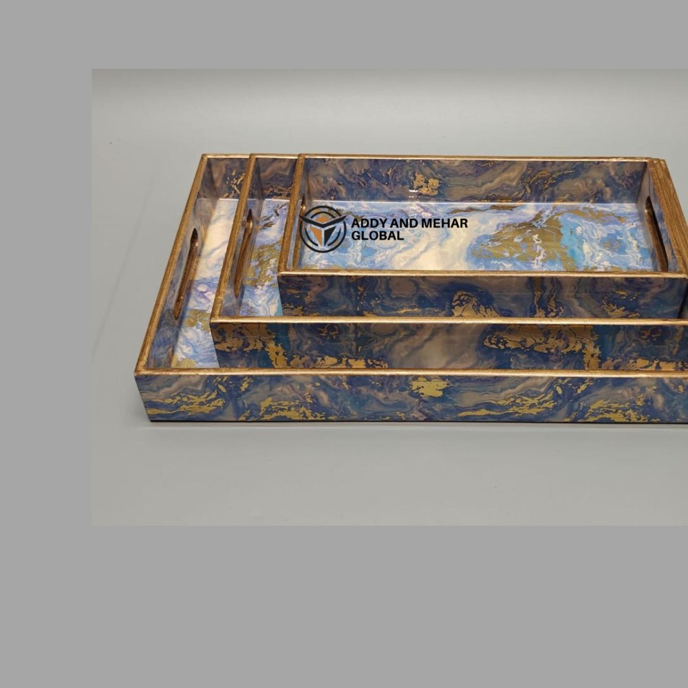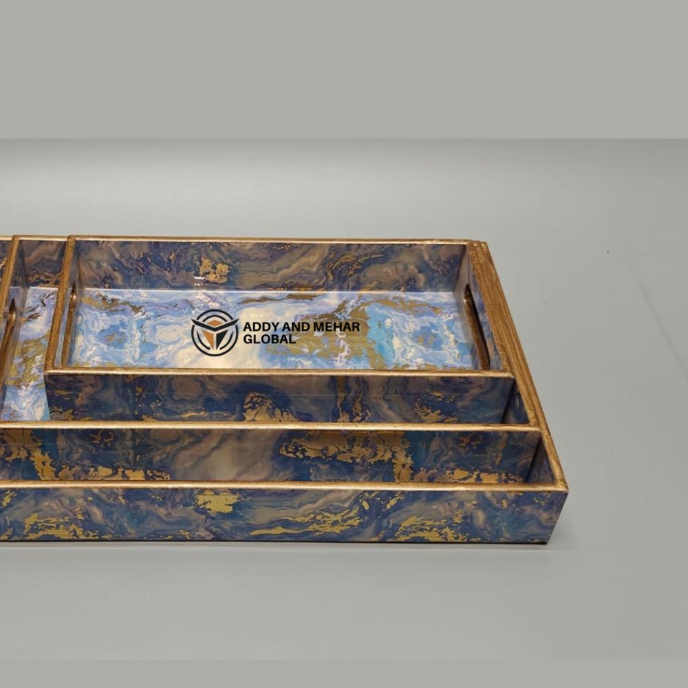 Add elegance and functionality to your dining and living space with this Geometrical Enamel Serving Tray Set of 3. Crafted from durable MDF material with a smooth paper enamel finish, these trays feature a stylish marble-inspired geometric design with golden accents. The nesting design allows easy storage while providing versatile use for serving tea, coffee, snacks, or displaying décor items. Perfect for modern homes, hospitality, and gifting.