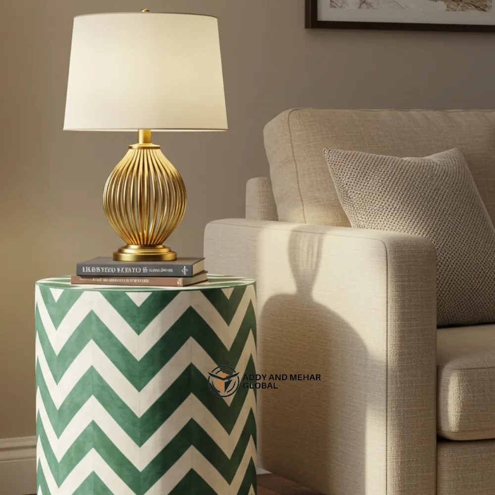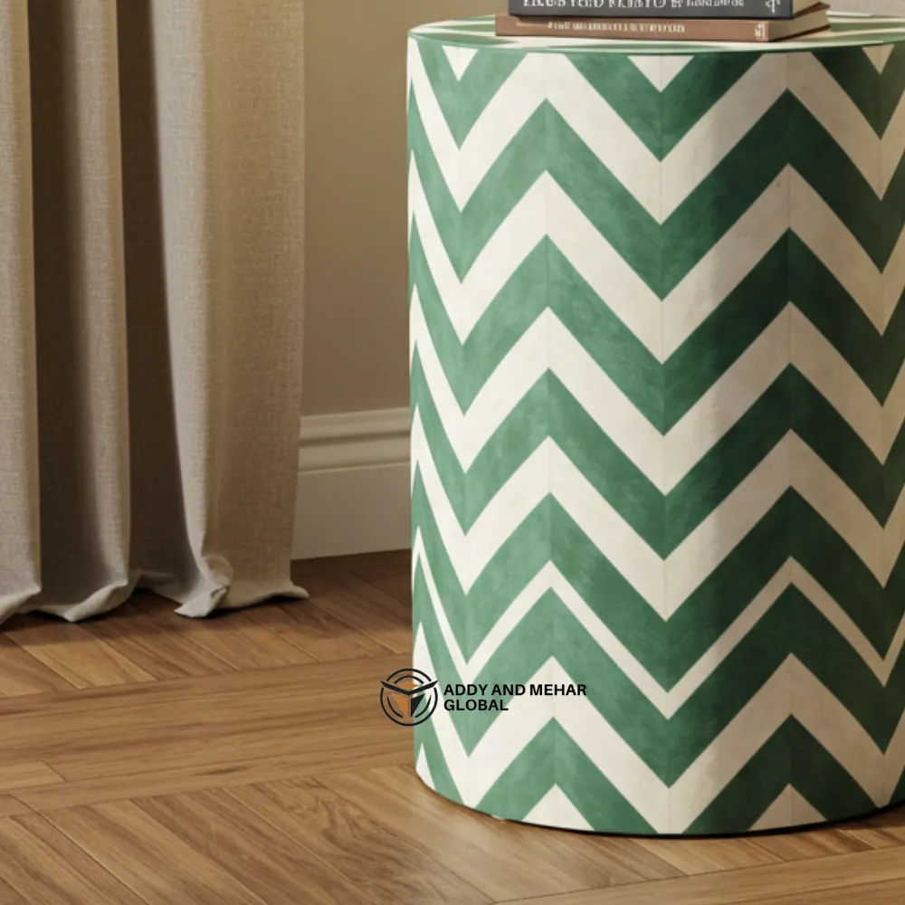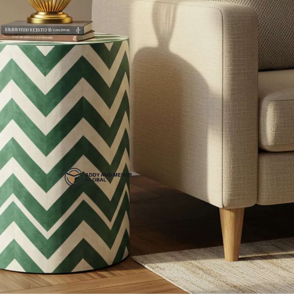 Enhance your space with this elegant green chevron bone inlay side table, a perfect fusion of handcrafted artistry and modern design. Carefully made by skilled artisans, this piece showcases a striking geometric chevron pattern, beautifully set against a rich green base that adds a refreshing and sophisticated touch to any room.