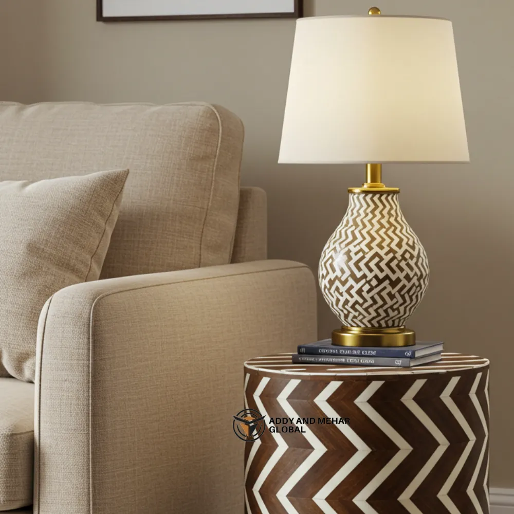 Add timeless craftsmanship to your living space with this beautifully handcrafted bone inlay chevron side table. Designed with a striking brown and white zigzag pattern, this elegant accent piece showcases the traditional art of bone inlay, carefully handcrafted by skilled artisans.