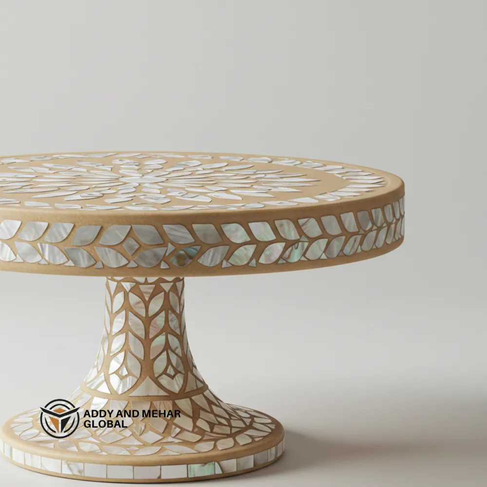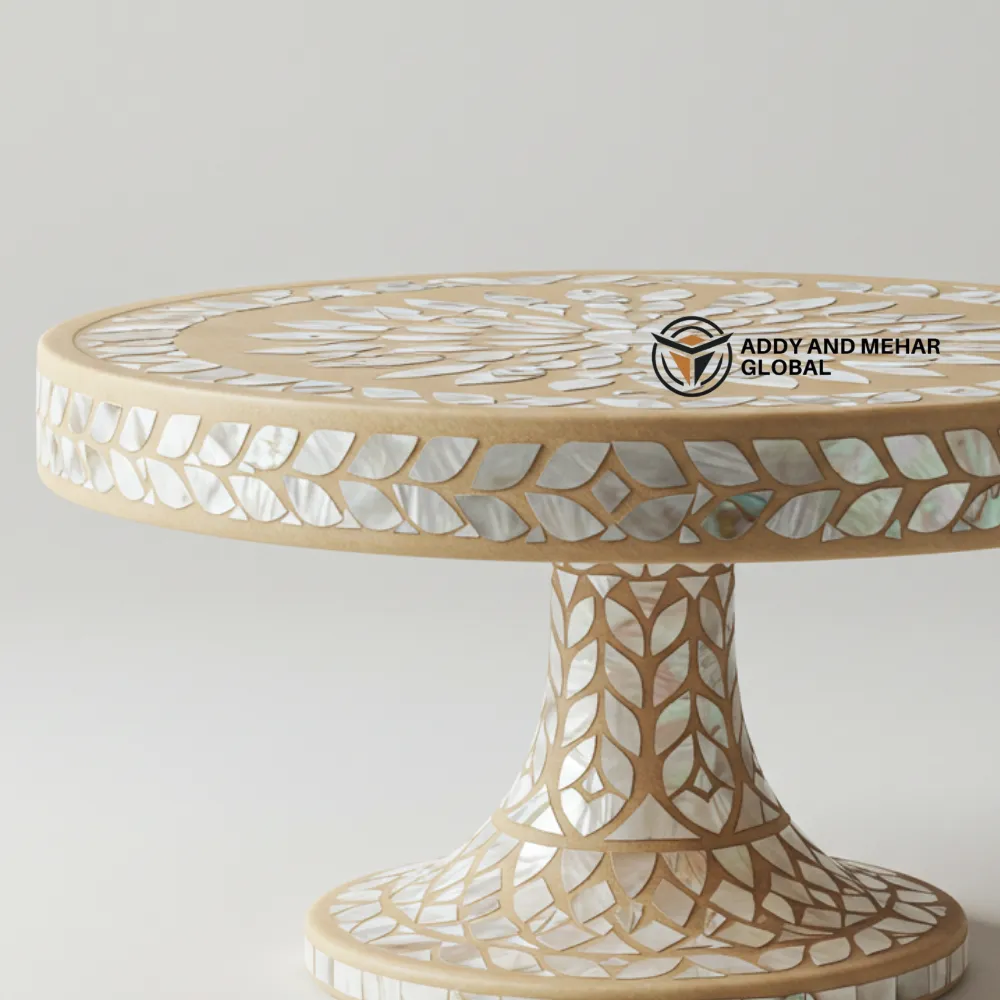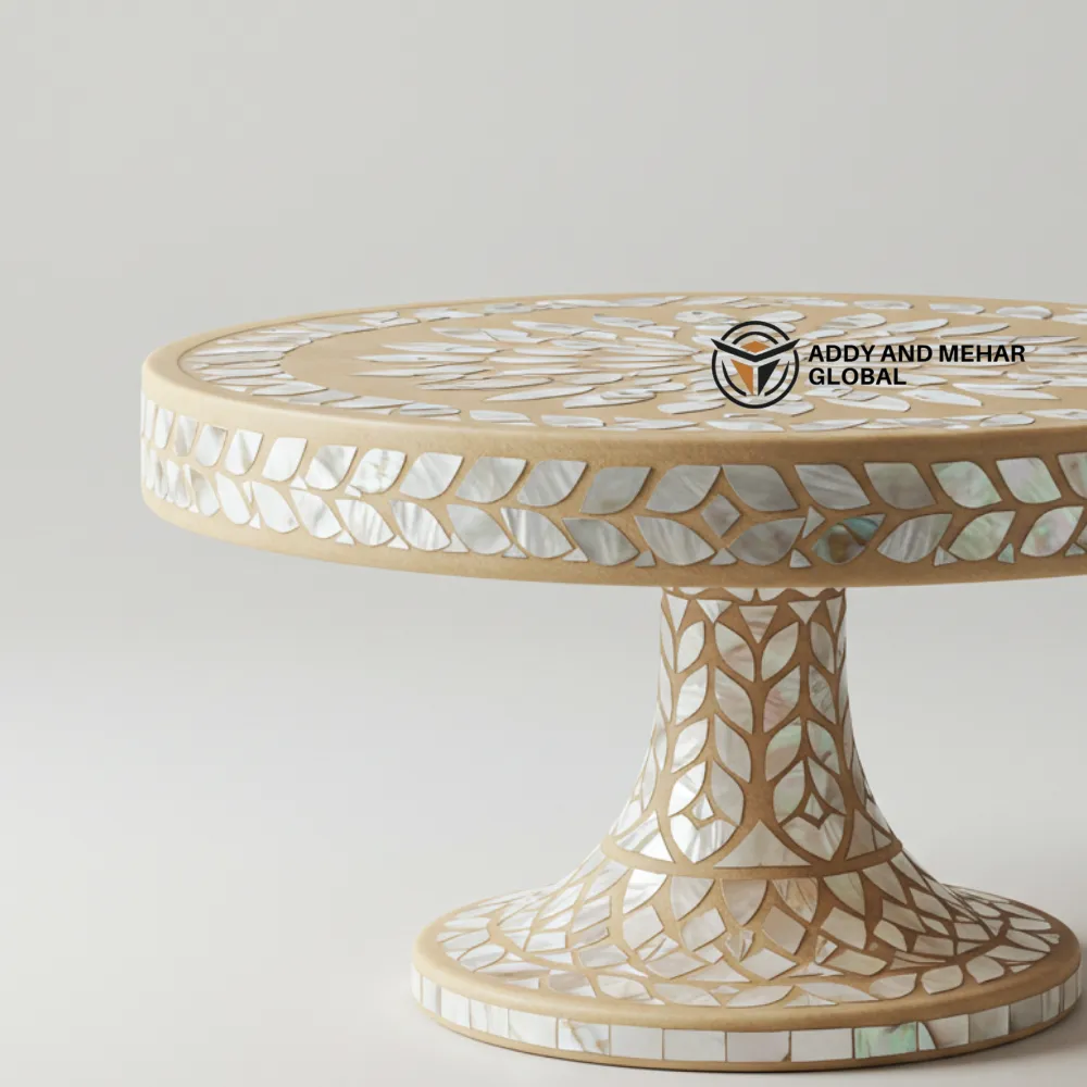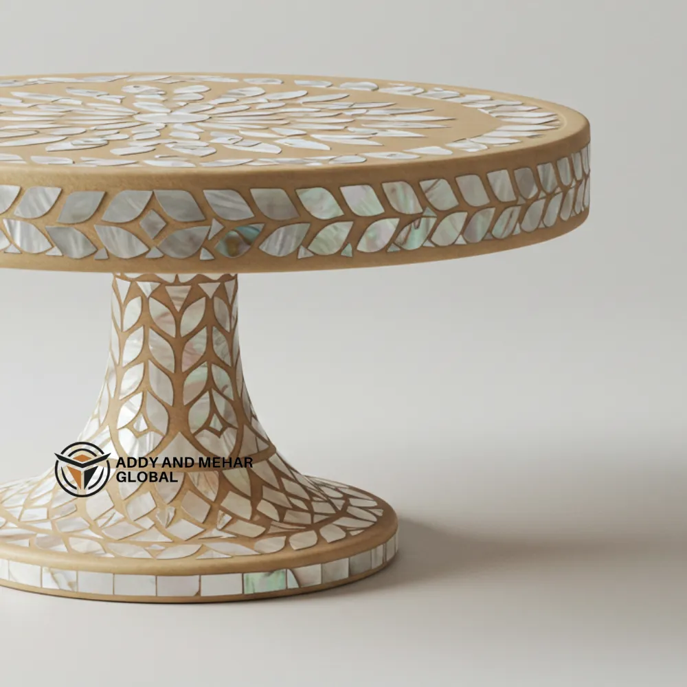 Carefully created by skilled artisans, this table blends traditional artistry with modern sophistication. The smooth, round tabletop offers a perfect surface for displaying decorative items, serving treats, or presenting cakes at special occasions. Its sturdy pedestal base ensures excellent balance and durability, making it as functional as it is stylish. Ideal for living rooms, dining spaces, or event décor, this piece adds warmth, luxury, and charm wherever it is placed.
