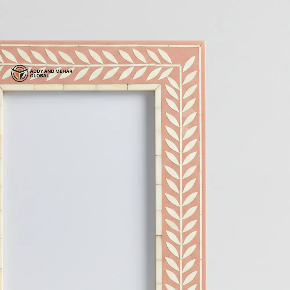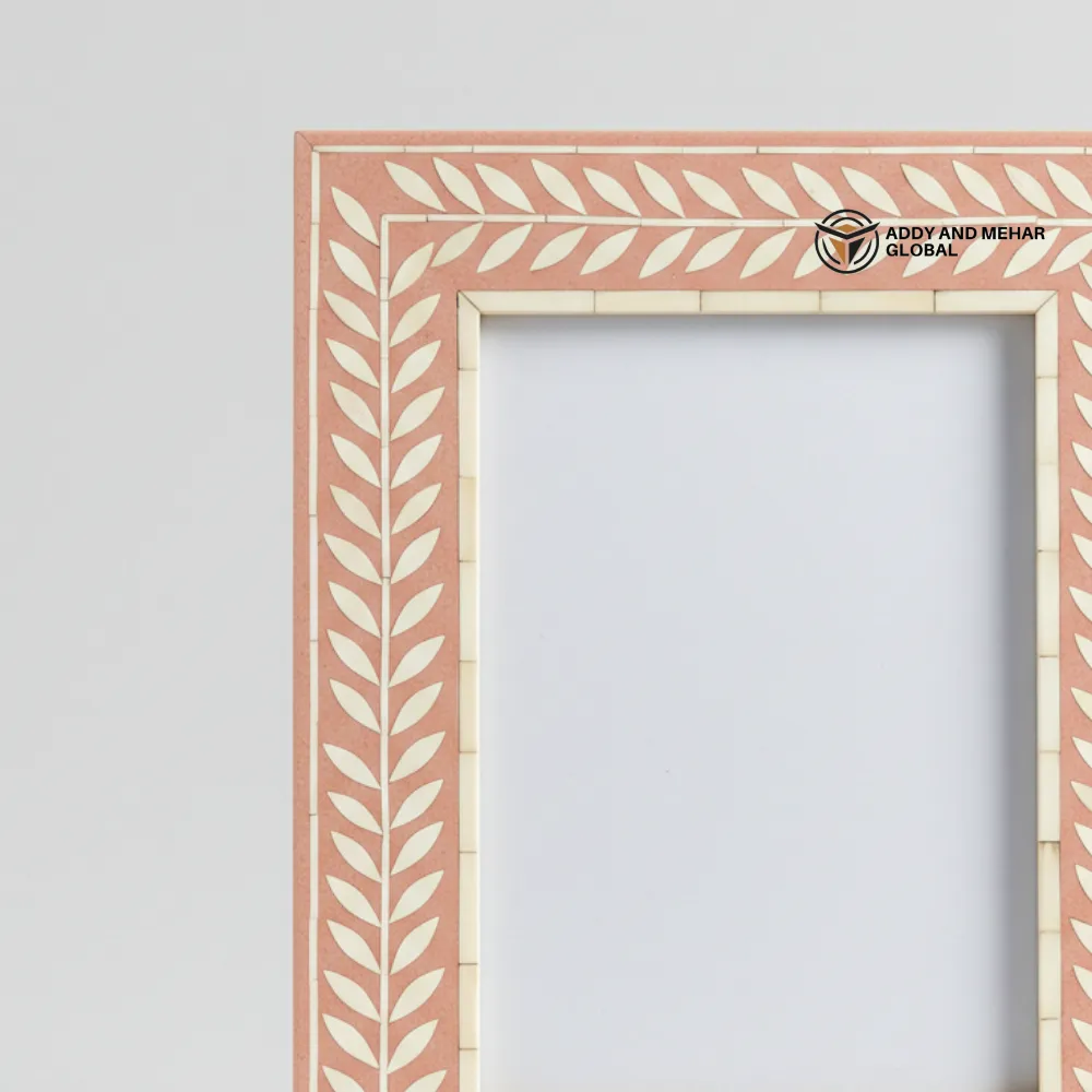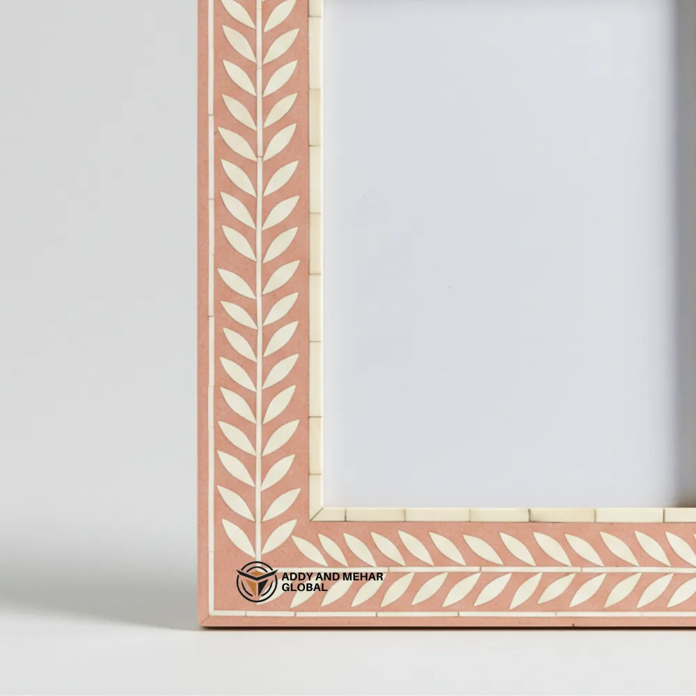 Enhance your décor with this Handmade Pink Bone Inlay Photo Frame, featuring a delicate leaf pattern design crafted by skilled artisans. The natural bone inlay set against a soft pink background creates a beautiful and elegant look. Perfect for displaying your favorite photos on a desk, shelf, or tabletop, this decorative frame adds a stylish touch to any space and makes a thoughtful gift for special occasions.