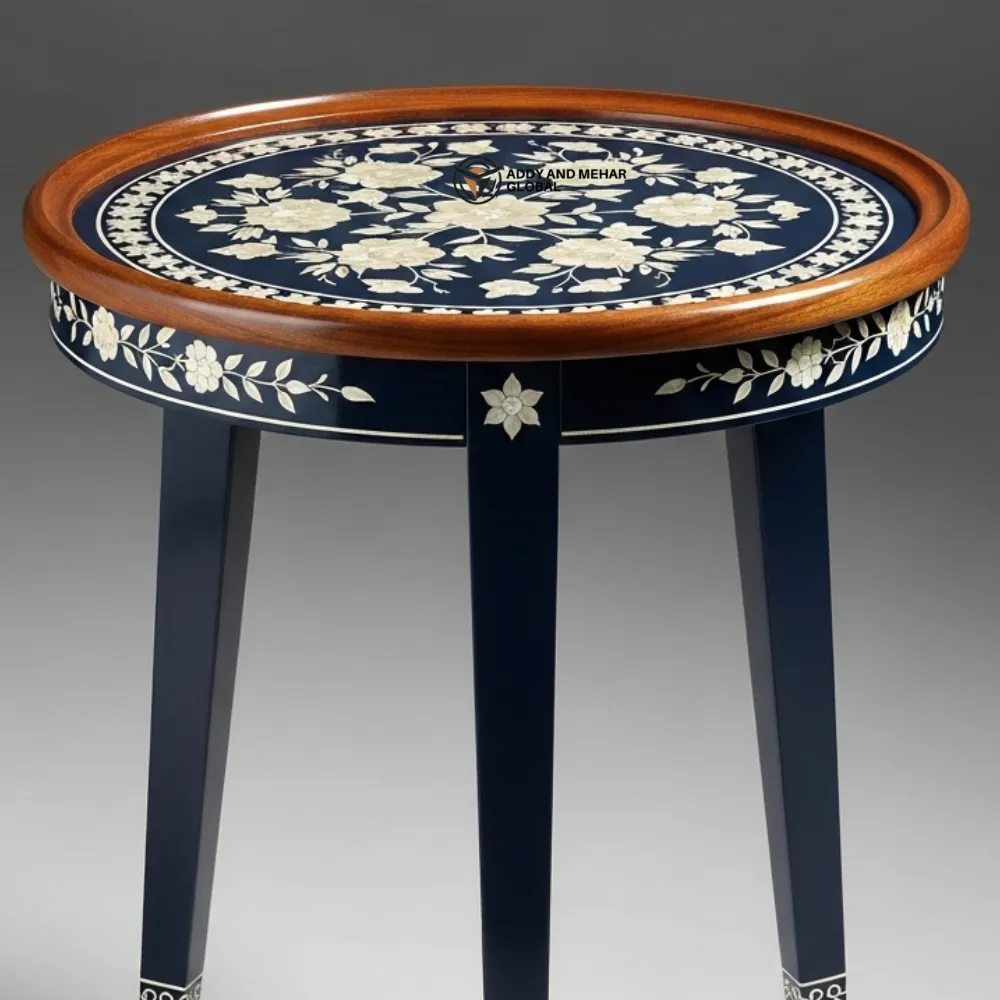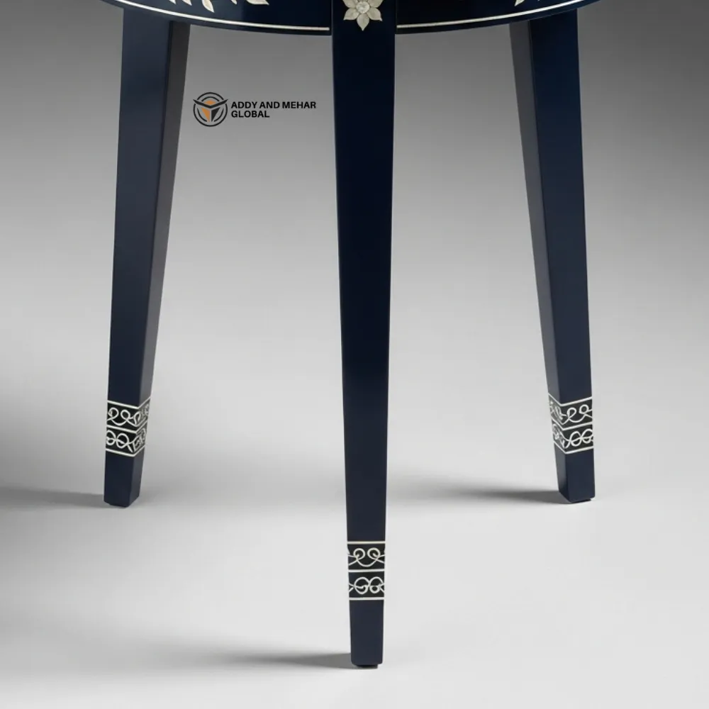Elegant blue Meena stool with floral inlay, handcrafted from solid wood—perfect as a stylish side table or accent piece for luxury interiors.
