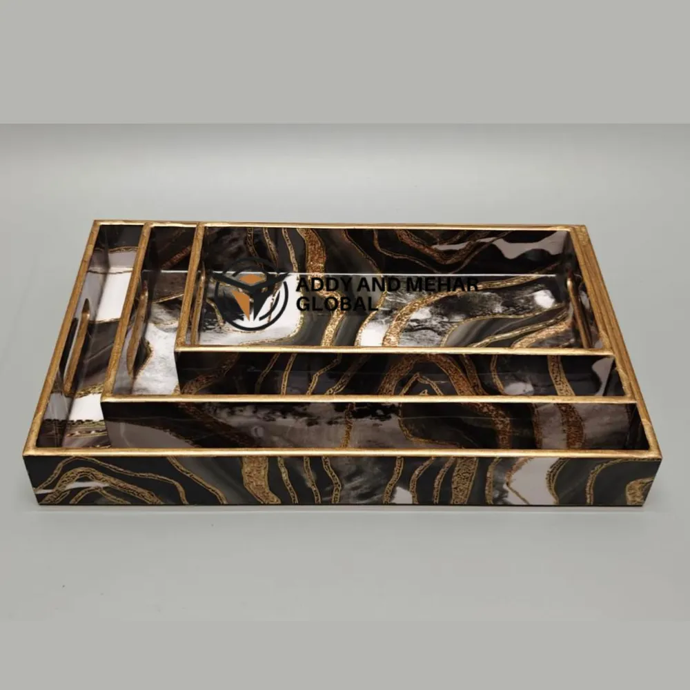 Vibrant orange and gold geometric serving tray set of 3 crafted from durable MDF and paper. Perfect for serving, organizing, and adding a modern decorative touch to any home.