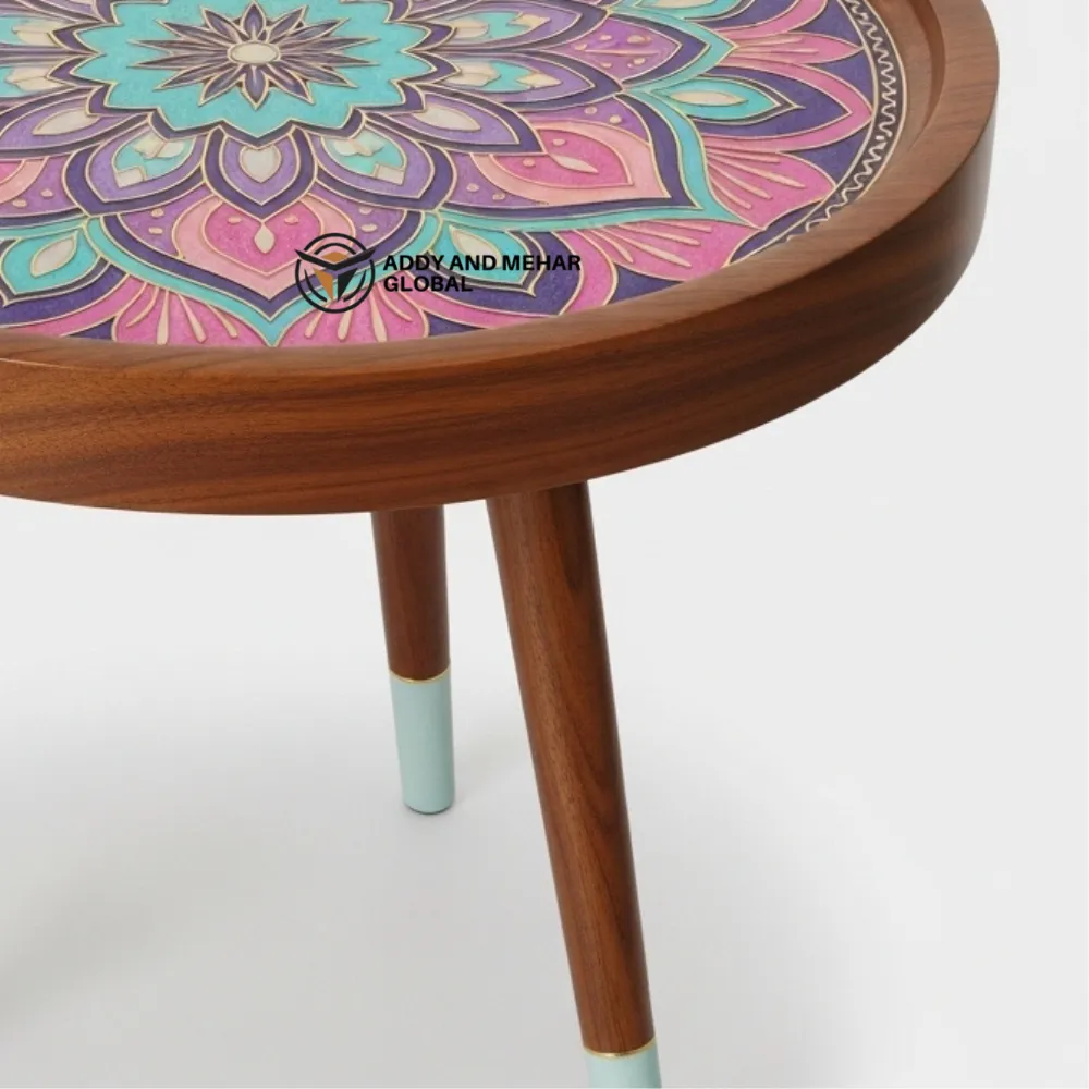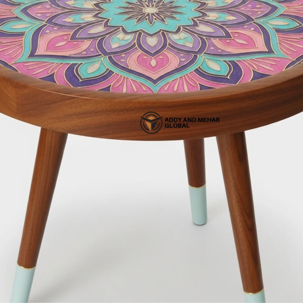 - Handcrafted wooden stool with elegant Pink Meena pattern